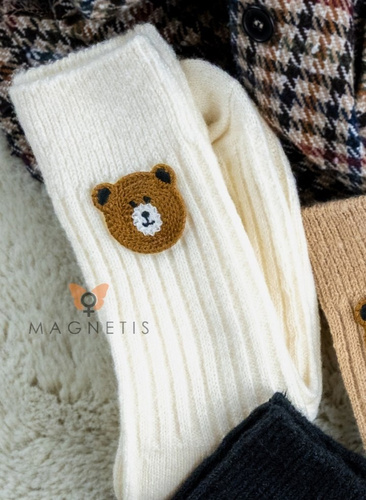 YN5031 Șosete calde pentru femei cu față de ursuleț de pluș Magnetis bej - cu nervuri și broderie