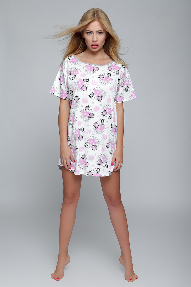 Cămașă pentru femei din bumbac 100% de înaltă calitate, care, combinată cu croiala largă, oferă confort maxim la purtare. Asigură libertate completă de mișcare. Decolteu original mare și supradimensionat, poate fi strecurat în mod sexy peste umăr. Tricou cu mânecă scurtă, decorat cu un model de pinguin. Finisaj semicircular în partea de jos. Se va adresa femeilor care iubesc moliciunea și libertatea.
