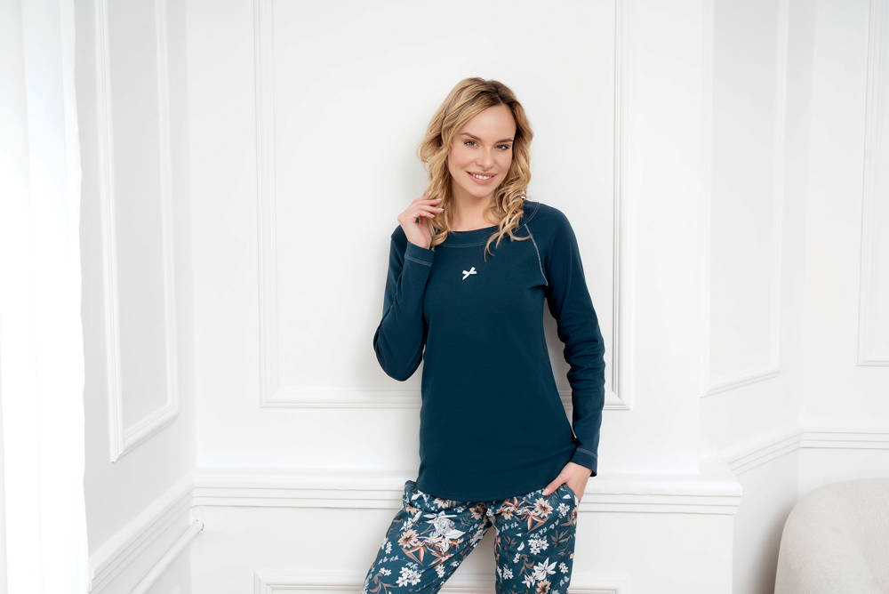 Nu se știe niciodată când o pijama elegantă va fi utilă! Acesta este sigur că va fi purtat cu plăcere de orice femeie. Pijamaua pentru femei cu pantaloni lungi și mâneci lungi va oferi confort, libertatea de a vă bucura de pielea dvs. în orice noapte. Materialul natural este respirabil și sigur, iar croiala clasică este o garanție a confortului. Partea de sus cu nervuri a pijamalei din bumbac pentru femei este finisată cu un decolteu rotund și o fundiță drăguță, în timp ce pantalonii au buzunare funcționale și sunt decorați cu un model floral frumos. Pijama clasică pentru femei disponibilă în mărimile S până la XL, în tonuri de culoare albastru, alb și bej.