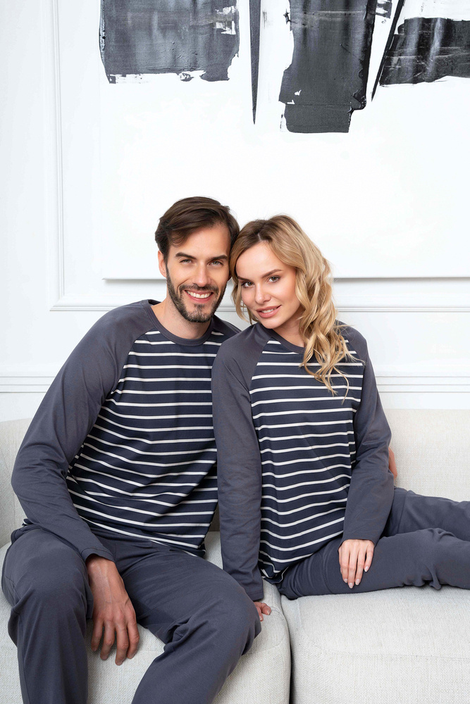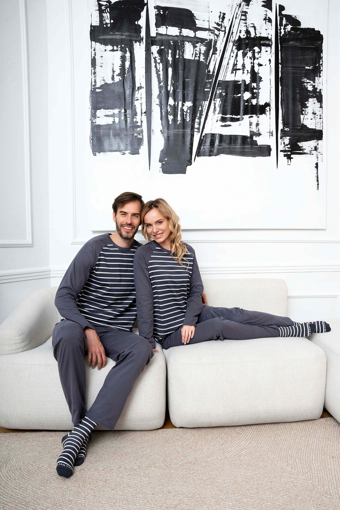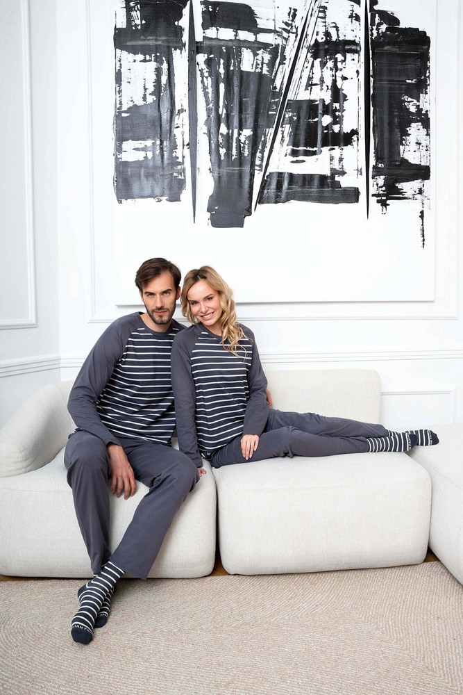 Klasyczna męska bawełniana piżama w ponadczasowy wzór pasów doskonale sprawdzi się zarówno w domu, jak i na wakacjach czy podczas służbowych wyjazdów. Lekki, przyjemny dla skóry materiał zapewni komfort snu, a luźny krój to gwarancja swobody i wygody. Taka męska piżama z długimi spodniami i długim rękawem to niezbędnik w szafie każdego pana lubiącego solidnie się wyspać. Piżama męska ze 100% bawełny dostępna jest w odcieniach grafitu i rozmiarach od S do XXL.