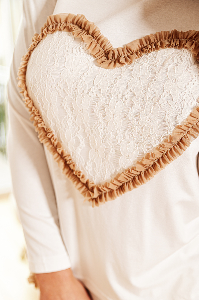 Bluză cu mâneci lungi, cu o croială ușor mai lejeră, decorată cu o inimă din dantelă învelită în tul delicat. Setul include, de asemenea, pantaloni lungi cu buzunare decorate cu volane din tul.