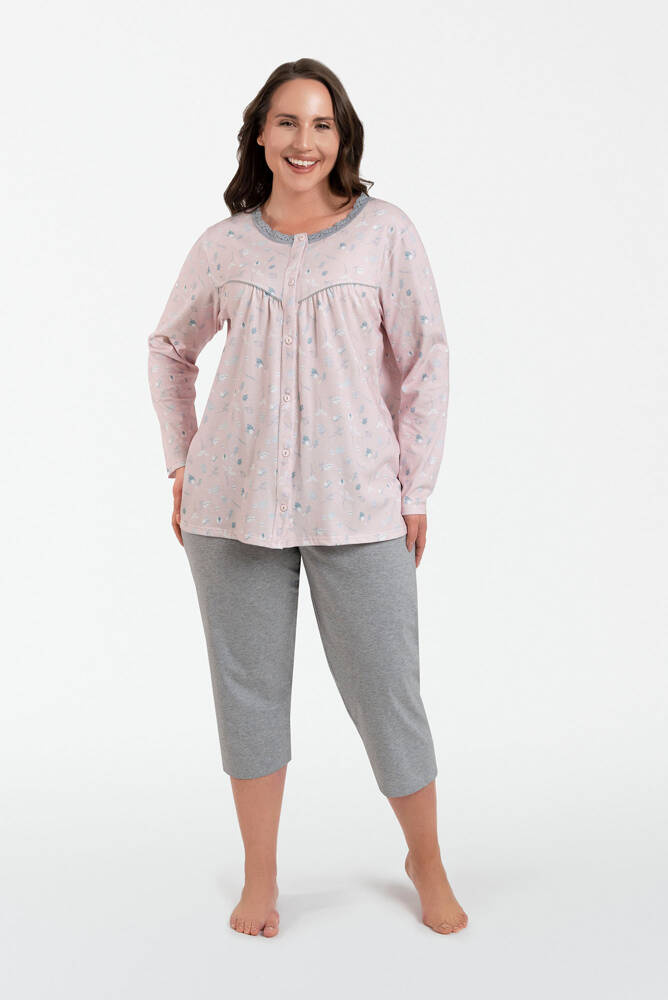 Astfel de pijamale sunt alegerea ideală pentru femeile care apreciază eleganța chiar și noaptea! Pijamalele pentru femei cu pantaloni ¾ și mâneci lungi vor impresiona cu tăietura lor unică. Hanoracul ei, complet cu nasturi, este finisat cu un decolteu rotund din dantelă și prezintă, de asemenea, cusături elegante deasupra bustului. Pantalonii, pe de altă parte, sunt complet drepți. Acest lucru face ca această pijama pentru femei să fie un pic retro și să arate foarte interesant. Modelul de ghindă de pe hanorac îi sporește farmecul. Pijamalele pentru femei din bumbac vă vor oferi confort și comoditate în timp ce dormiți și vă vor permite pielea să respire liber. Pijamalele elegante pentru femei sunt disponibile în mărimile M până la XXXL, în nuanțe de roz și gri melange.