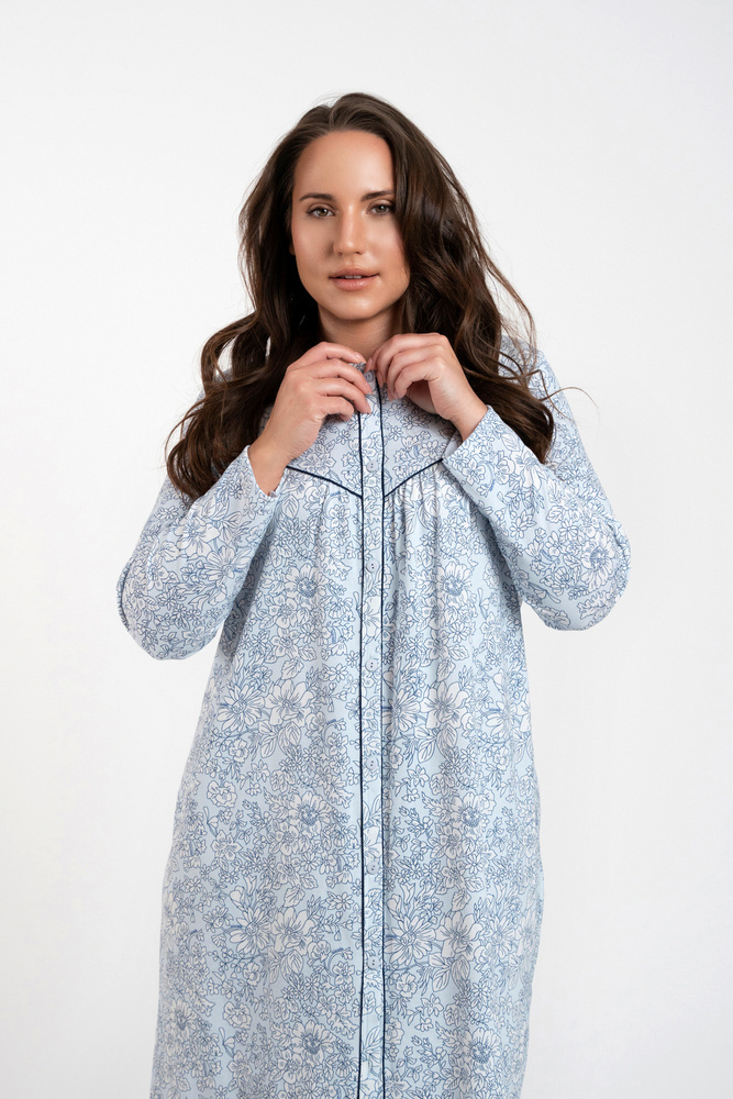 Cămașa de noapte cu mâneci lungi, descheiată pentru femei, este alegerea perfectă atât pentru vară, cât și pentru nopțile mai răcoroase. Bumbacul 100% prietenos cu pielea va oferi confort termic adecvat, iar motivul floral delicat va fi pe placul fiecărei femei. Cămașa de noapte pentru femei este descheiată până la capăt și are, de asemenea, un decolteu rotunjit și cusături decorative pentru un plus de atractivitate. Acest tricou de bumbac pentru femei este o garanție a confortului și libertății în fiecare noapte. Cămașa de noapte pentru femei este disponibilă în mărimile M până la XXXL și într-o schemă de culori albastru și alb.