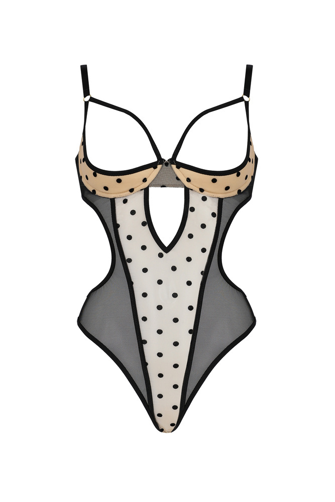 Otwarte usztywnione z fiszbiną miseczki w połączeniu z okalającymi piersi paseczkami. Wycięcia które wysmuklają sylwetkę i te urocze kropeczki… cudowne połączenie wysokiej jakości materiałów sprawiło że body prezentuje się oszałamiająco. Model dostępny w dwóch wersjach kolorystycznych - czerni i beżu.