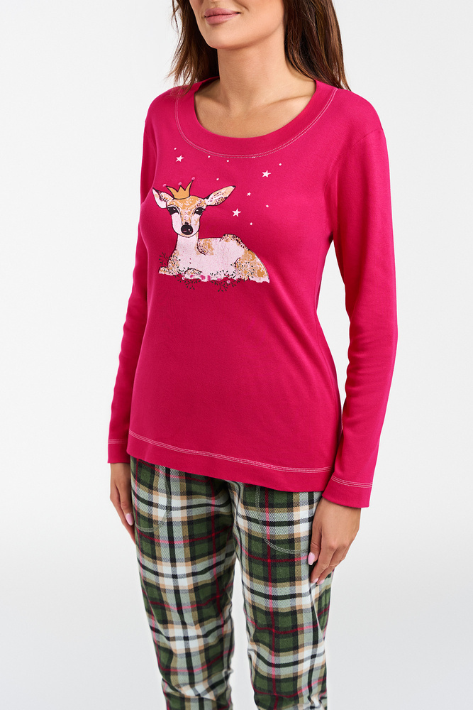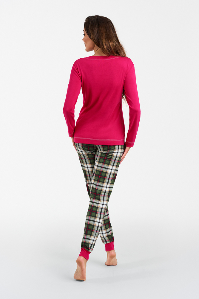 Cred că tuturor le-ar plăcea să aibă în garderobă pijamale la modă, cool. Acesta este! Pijamalele pentru femei cu pantaloni lungi și mâneci lungi vor oferi confort, libertate, confort și căldură - tot ceea ce vă așteptați. Pijamaua de damă din bumbac cu carouri are pantaloni cu model peste tot, împodobiți cu o margine colorată și un top cu decolteu rotund și grafică fermecătoare, produsă printr-o metodă de serigrafie durabilă. Acestea sunt pijamalele perfecte pentru serile reci! Pijamalele pentru femei la modă sunt disponibile în mărimile S până la XL, în două opțiuni de culoare - nuanțe de verde cu roz și nuanțe de verde.