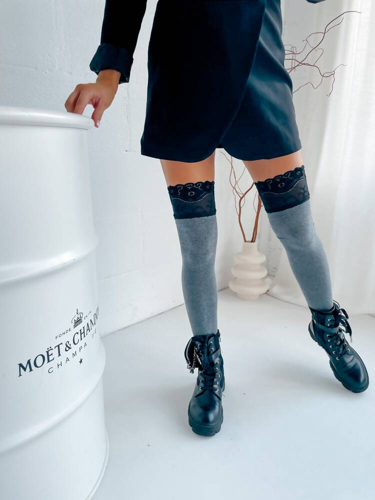 1085 Szeroka Koronka Zakolanówki damskie Milena - szary