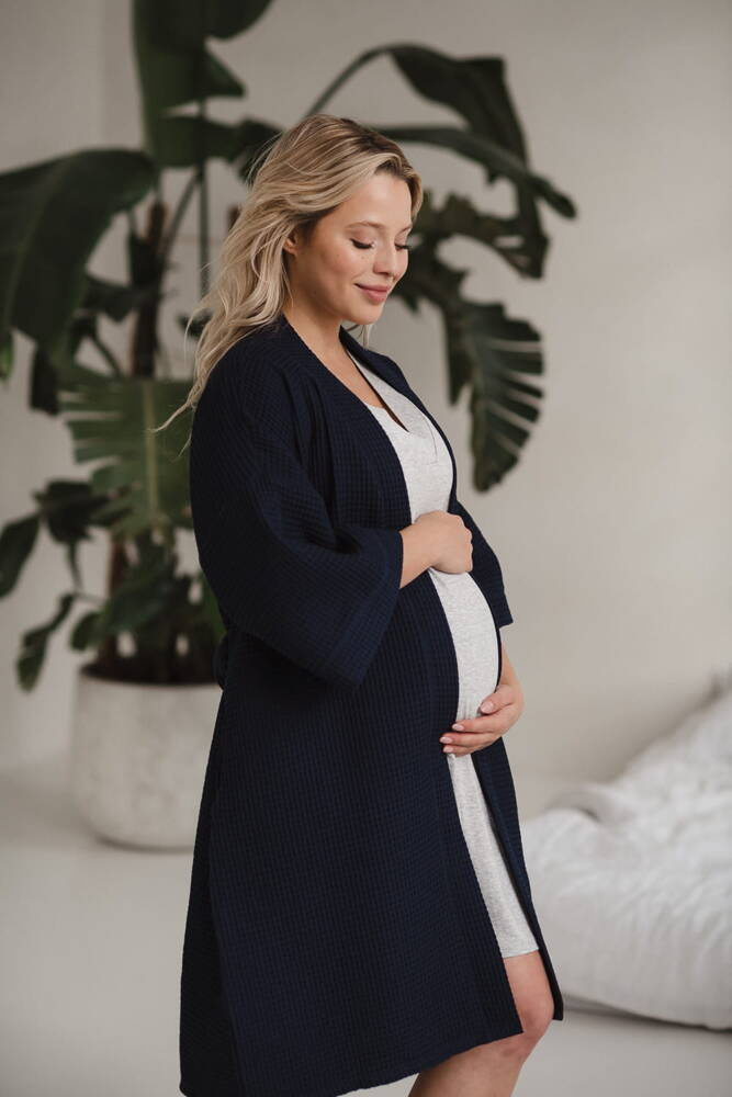 Szlafrok został zaprojektowany z myślą o mamach, dlatego jest nieco dłuższy, abyś spokojnie okryła nim ciążowy brzuszek. Po porodzie bez skrępowania b będziesz mogła spacerować po szpitalnym korytarzu lub na leżąco nakarmiła maluszka w połogu. Posiada kieszenie na niezbędne drobiazgi i pasek do regulowania szerokości.