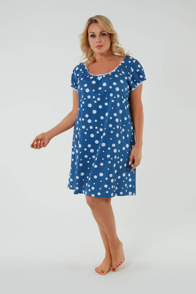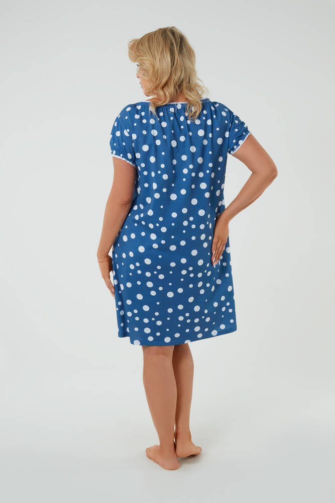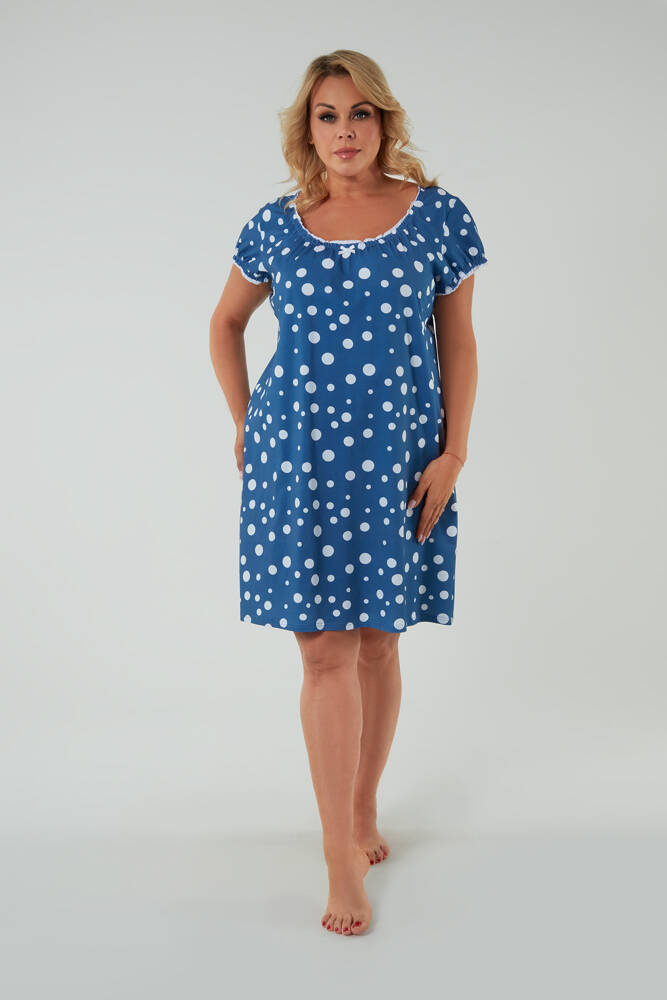 Cămașă de noapte pentru femei cu o croială clasică, confortabilă și un imprimeu decorativ și atractiv cu mazăre. Topul este completat de un decolteu rotund mare, cu volane. În plus, datorită faptului că are o bandă elastică practică, este și o cămașă de noapte ideală pentru alăptare. La decolteu, în centru, există o fundă decorativă din satin. Modelul are mâneci scurte, de asemenea împodobite cu un volan. Cămașa noastră de noapte este fabricată în întregime din bumbac, care este plăcută la atingere nu numai pentru mamă, ci și pentru copil.
