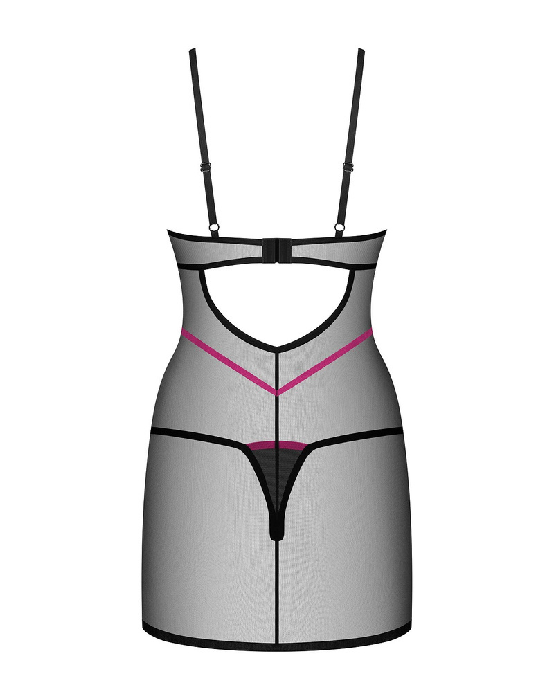 Zmysłowy komplet wykonany z przeźroczystej tkaniny. Delikatna czerń została ozdobiona kolorowymi akcentami, które przyciągają spojrzenie.