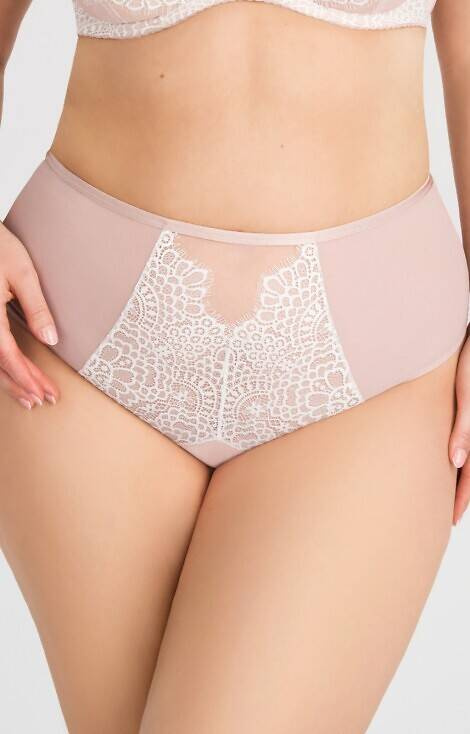 Chiloți pentru femei cu părți mai pline. Tăietură deschisă care acoperă aproape toate fesele. Fabricat din tul elastic cu elemente de dantelă pe tul stabil. Spate din tul elastic cu un finisaj neted, astfel încât chiloții să nu se vadă sub haine. Picioare din bumbac prelungite pentru un confort sporit. Decupaj semicircular în talie la spate. Piese metalice din aur roz.