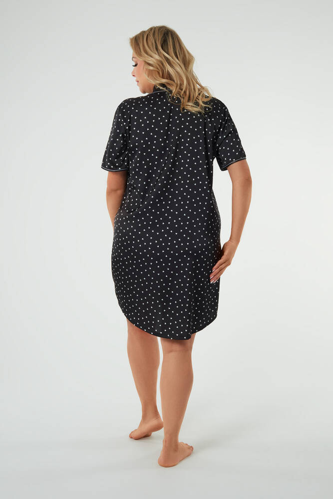 Dacă sunteți interesat de cămăși de noapte elegante, ați ajuns în locul perfect. Cămașa de noapte din satin pentru femei este o opțiune care va adăuga o notă specială garderobei tale de noapte. Are o croială largă, clasică, care vă va face să vă simțiți confortabil nu numai seara, ci și dimineața. Este o cămașă de noapte descheiată pe toată lungimea, cu nasturi practici. Decolteul în formă de V este finisat cu un guler clasic cu o bordură distinctivă. Există, de asemenea, un buzunar mic pe partea din față. Totul este împodobit cu un model de inimi fermecătoare. Această cămașă de noapte din satin are, de asemenea, mâneci scurte, care vor funcționa bine în primăvară și vară.