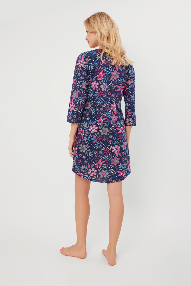 Această cămașă de noapte din bumbac este pentru femeile care doresc să aducă puțină finețe garderobei lor de noapte. Are o croială confortabilă, ușor evazată, care vă va menține confortabil în timp ce dormiți. Se distinge printr-o imprimare la modă de flori și frunze colorate, ceea ce face ca întregul aspect să fie foarte original. Cămașa de noapte descheiată are, de asemenea, o închidere practică cu nasturi și mâneci de lungime ¾.