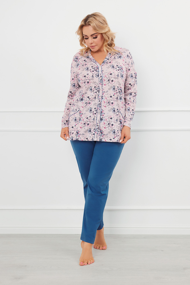 Pijama moale din bumbac moale. Setul din două piese constă dintr-un hanorac cu crampoane și pantaloni cu o talie elastică confortabilă. Datorită posibilității de desfacere a întregului top, pijamalele sunt ideale pentru femeile care alăptează.