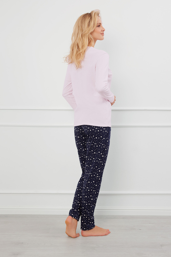 Pijama de damă descheiată, din tricot de bumbac cu nervuri, care se distinge printr-un design atemporal. Are o croială clasică cu mâneci lungi și un decolteu în V, care a fost împodobit cu fir fin într-o culoare contrastantă. Pantalonii lungi cu imprimeu de stele la modă atrag privirile. Buzunare practice, inserate pe părțile laterale. Adăugați faptul că aceasta este o pijama descheiată pentru femei, iar panoul de nasturi clar marcat adaugă o notă de clasă și grație întregului aspect.
