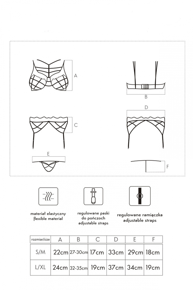 Komplet bielizny o eleganckim kroju. Biustonosz na cienkich, regulowanych ramiączkach. W komplecie stringi i pas do pończoch.
