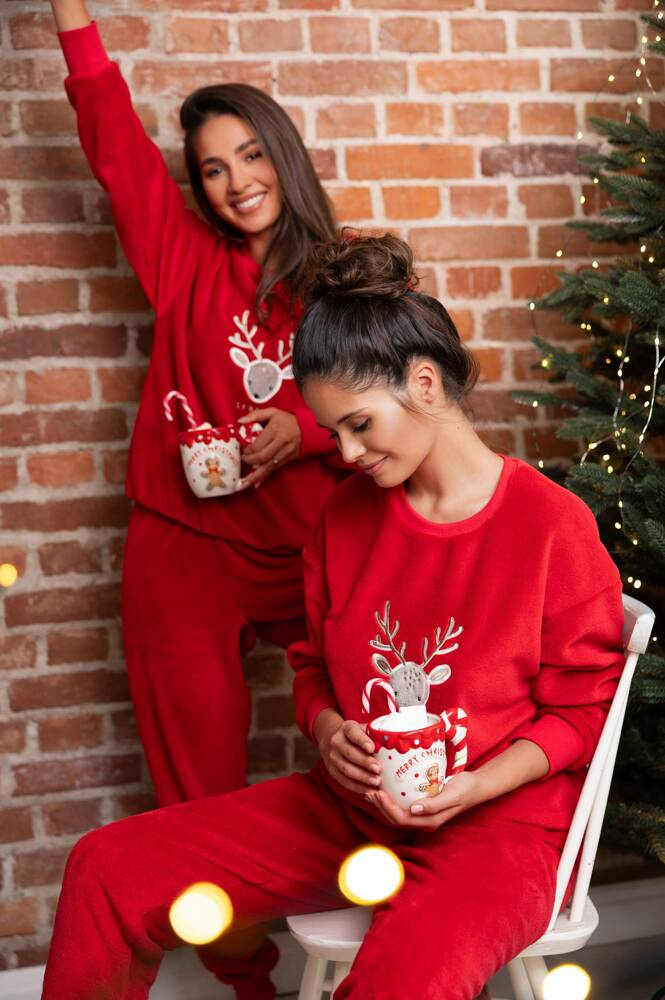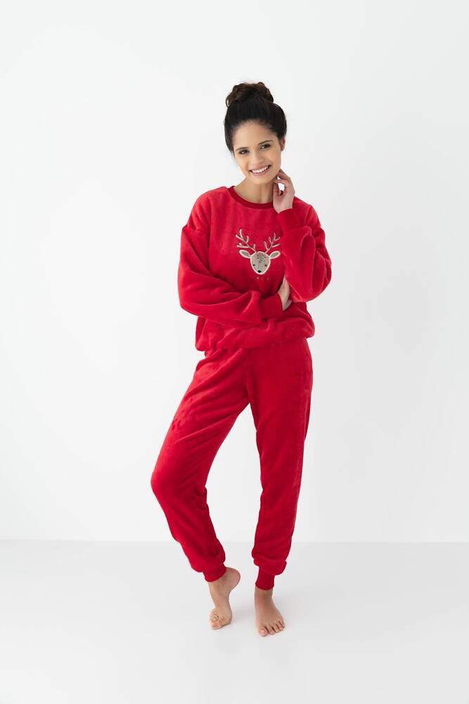 Pijama de damă din material moale de înaltă calitate. Tricou cu mânecă lungă, decorat cu un motiv festiv.Completați cu pantaloni lungi, uni. Pantaloni terminați cu un cordon. Setul îmbunătățește perfect formele.