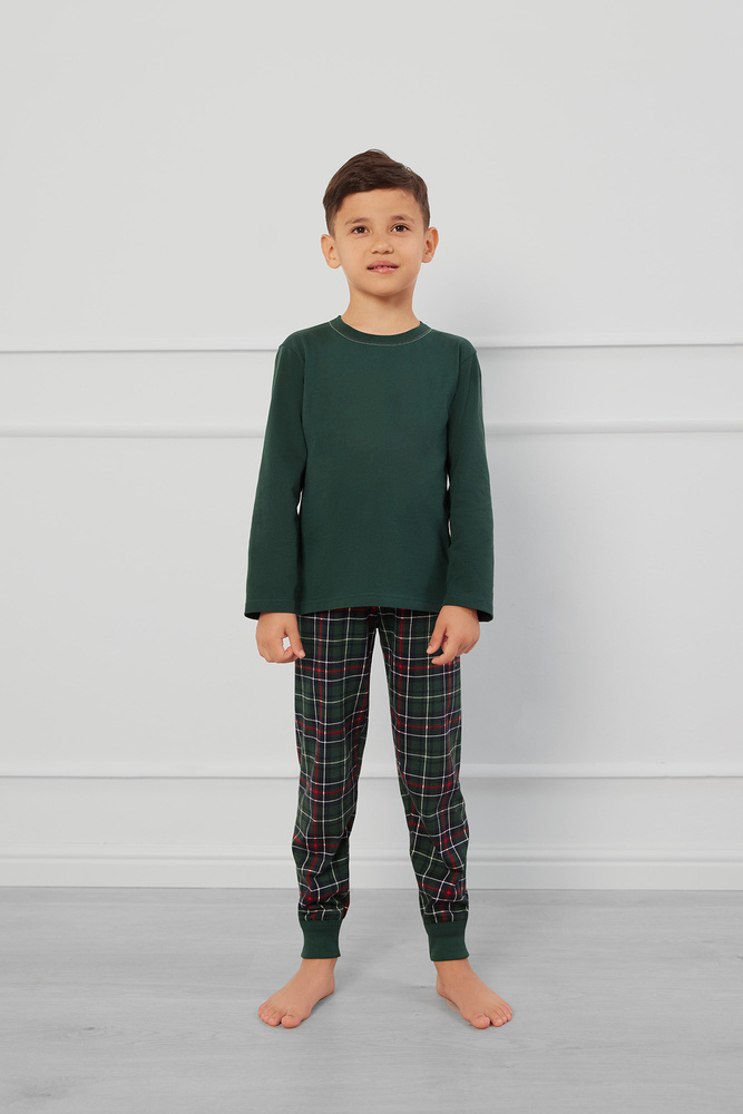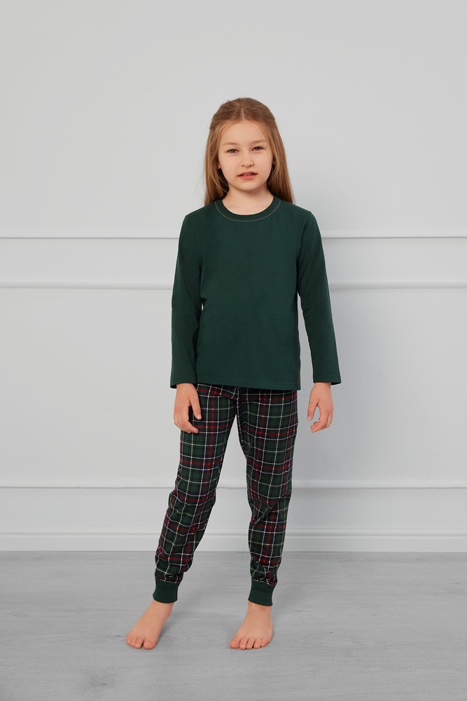 Această pijama pentru copii cu căptușeală dreaptă este compusă dintr-o bluză unicoloră cu decolteu rotund și pantaloni în carouri cu o talie practică cu cordon. Croiala clasică nu restricționează mișcarea, iar materialul moale, de înaltă calitate, este prietenos cu pielea, garantând căldură și confort pe tot parcursul nopții.