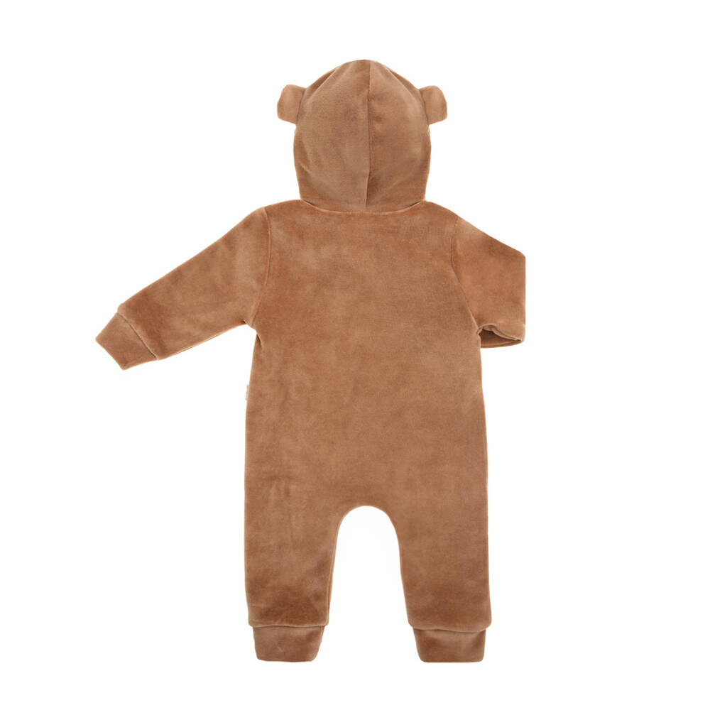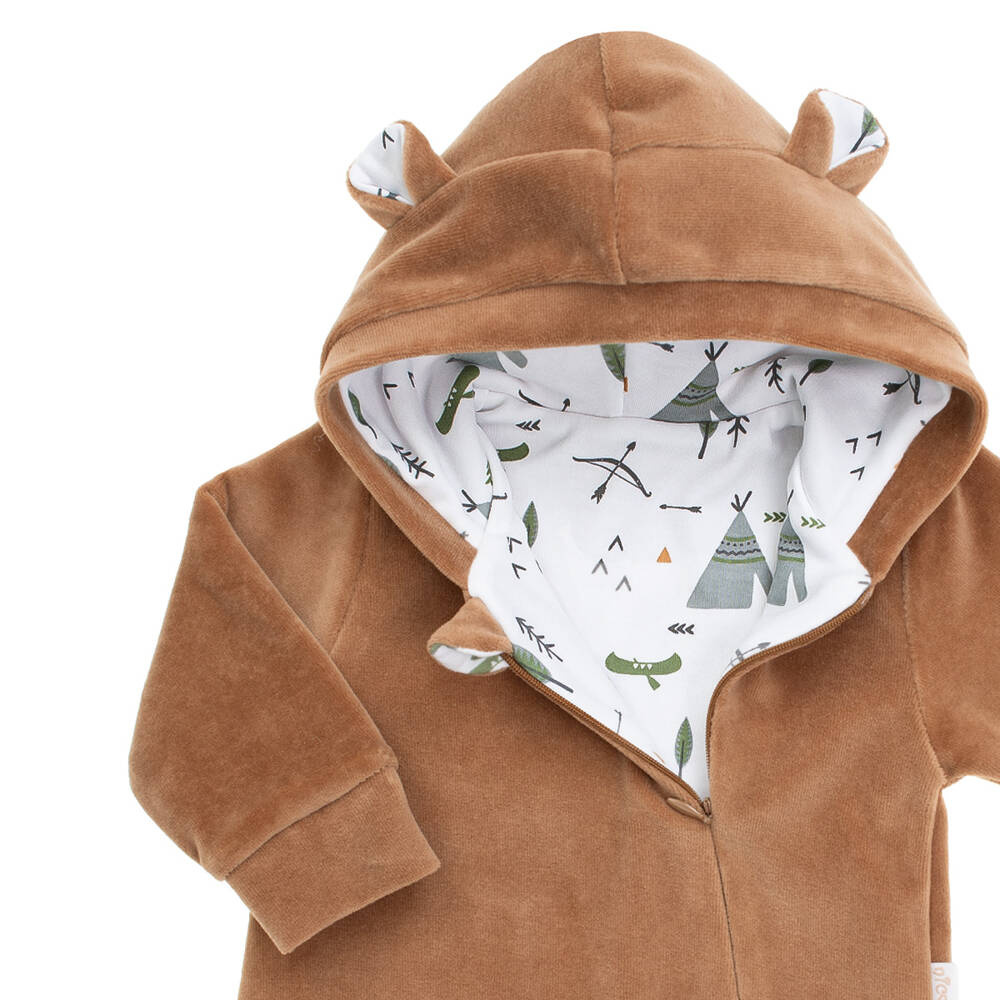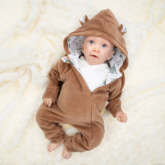 Clovn de catifea in culorile maro si bej. Căptușeală din bumbac alb 100%. Perfect pentru zilele mai reci. Are manșete pe picioare și mâneci. Material sigur pentru copii.