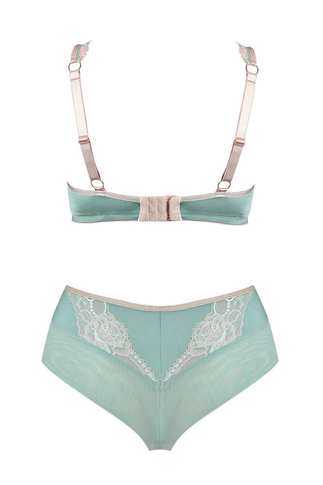 Slip brazilian. Spate croit înalt din microfibră verde. Fata din dantela bej cu motiv floral cu fir verde, laterale din microfibra. Există un ornament bej în talie cu un decor de bijuterii în formă de cerc.