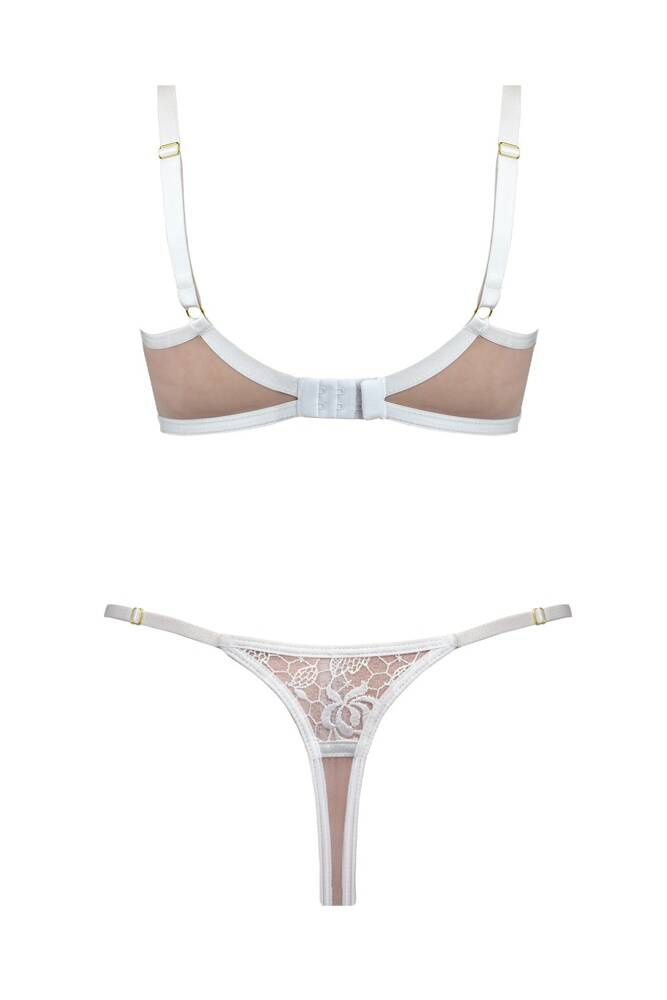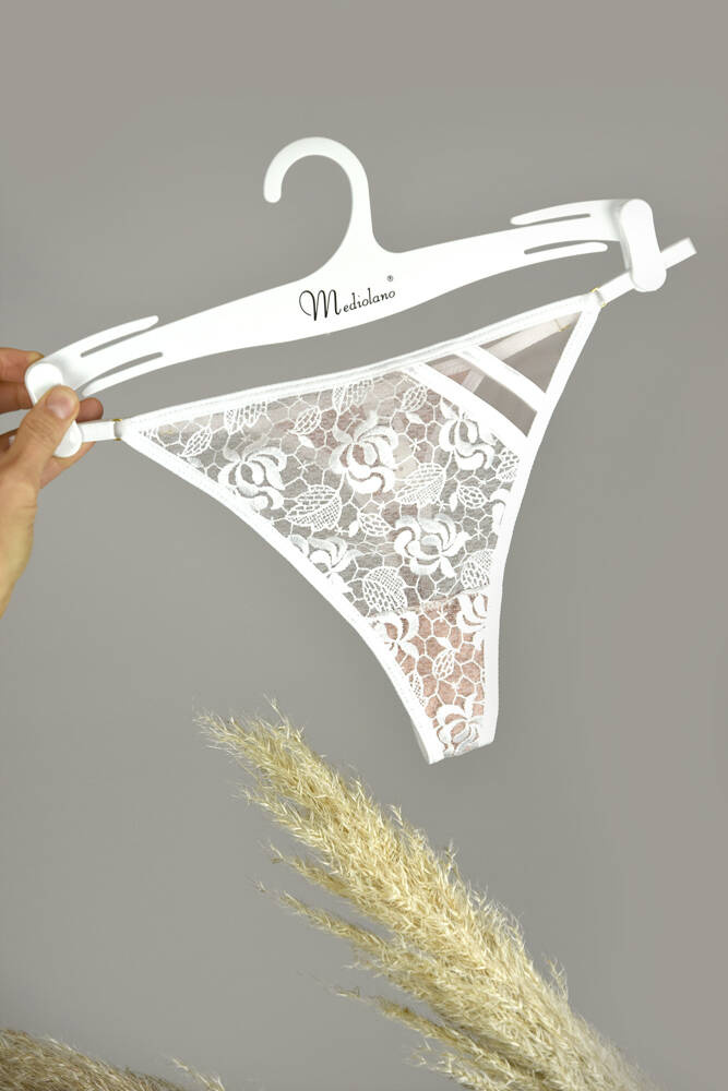 Tanga din stofa alba, captusita cu plasa bej, lateralele sunt benzi subtiri cu lungime reglabila