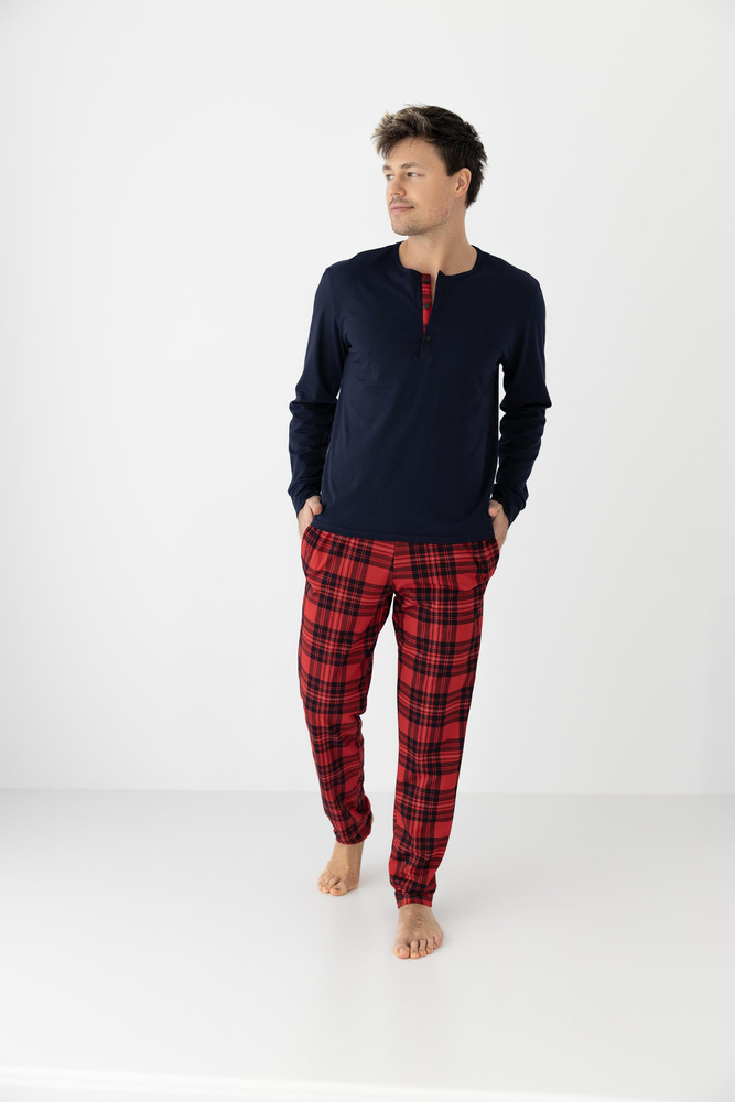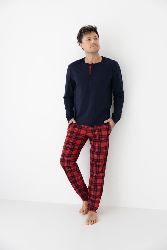 Pijamale bărbătești confortabile, confecționate din bumbac de înaltă calitate.  Tricou cu mânecă lungă. Pantaloni lungi asortați, cu model, și buzunare practice.