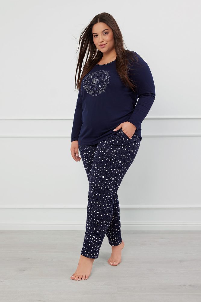 Pijama elegantă pentru femei, împodobită cu un motiv cosmic. Întreaga piesă este realizată din jersey de bumbac moale. Are o croială clasică, confortabilă. Topul la modă, cu un imprimeu cu faze de lună, se potrivește perfect cu fundul cu imprimeu cu stele. Întreaga piesă are mâneci lungi și picioare lungi. Aceasta este o pijama din bumbac pentru femei, caracterizată prin moliciune, netezime și rezistență ridicată la întindere.