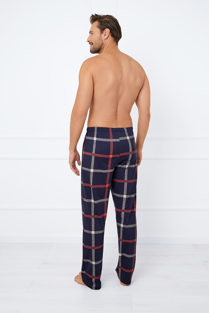 Confecționați din bumbac moale 100%, pantalonii de pijama pentru bărbați au o croială dreaptă și sunt decorați cu un model în carouri largi în nuanțe de albastru marin, alb și roșu, conferindu-le un aspect elegant, dar atemporal. Echipate cu buzunare practice pe părțile laterale, acestea oferă funcționalitate suplimentară. Talia pantalonilor a fost îmbogățită cu un cordon decorativ pentru a spori aspectul elegant.