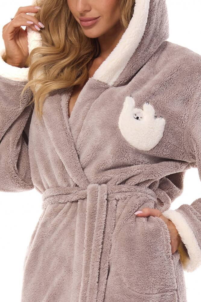 Halat de baie de damă cu glugă din tricotaje moi. Aplicare pufoasă pe piept.