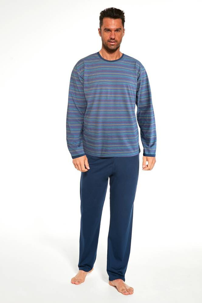 Pijamale pentru bărbați din bumbac de înaltă calitate. Hanorac cu mâneci lungi în dungi, gât rotund. Setul include pantaloni drepti lungi. Ambalat într-o cutie.