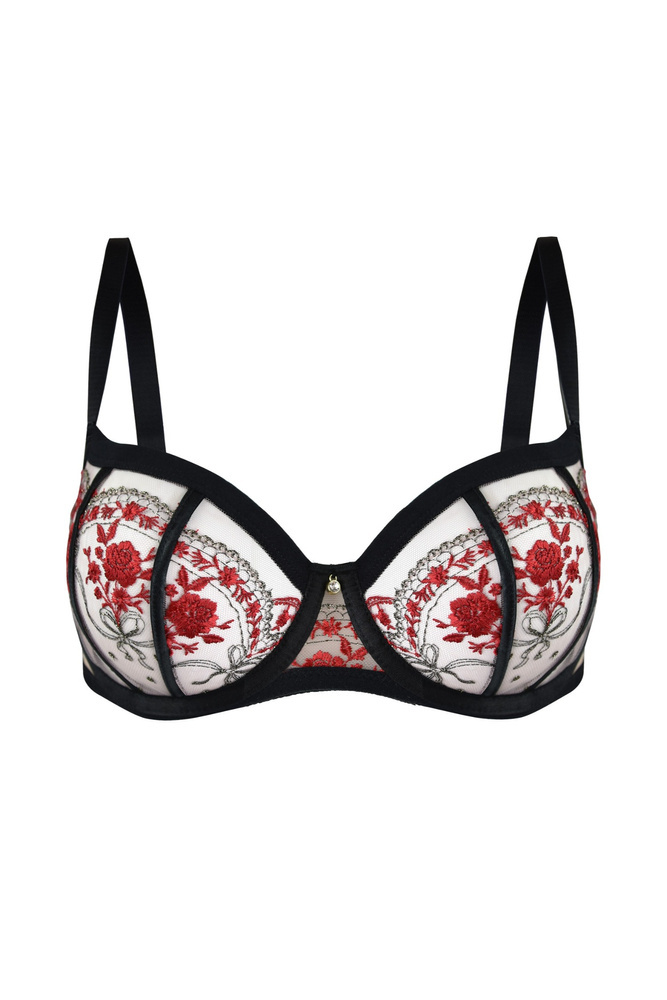 Sutien cu balcon. Cupele sunt realizate din plasă delicată de culoarea moka și sunt decorate cu dantelă atrăgătoare cu fir auriu, care conferă lenjeriei un caracter luxos. Tăieturile verticale ale cupelor subliniază subtil ornamentul negru, iar designul balconnet evidențiază și ridică perfect bustul. Circumferința plasă bej este întărită cu benzi negre, asigurând confort și o potrivire perfectă.