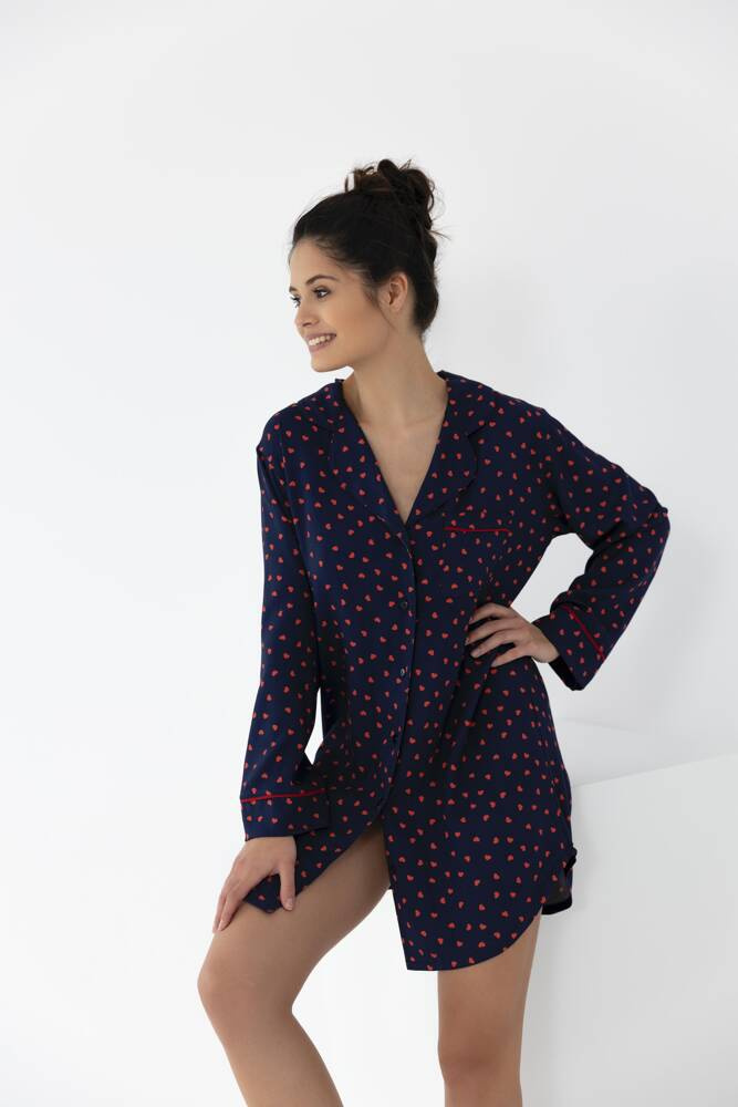 Cămașă de noapte pentru femei cu mâneci lungi și închidere cu nasturi. Prezintă un buzunar la piept și este confecționată din viscoză delicată cu model decorativ în formă de inimă.  Un design foarte confortabil, perfect pentru femeile care apreciază delicatețea și libertatea.