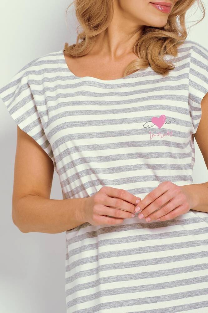 Cămașă de damă cu mâneci scurte. Totul este realizat din bumbac cu dungi de înaltă calitate. Decolteu semi-rotund. Lungime deasupra genunchiului