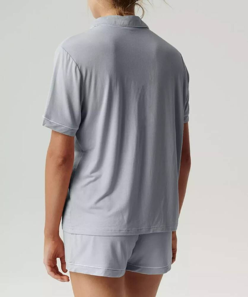 Pijamale de damă din material moale, plăcut la atingere. Tricou cu mâneci scurte cu nasturi. Setul include pantaloni scurți cu o talie elastică confortabilă