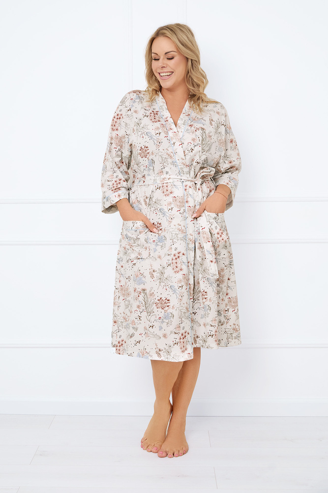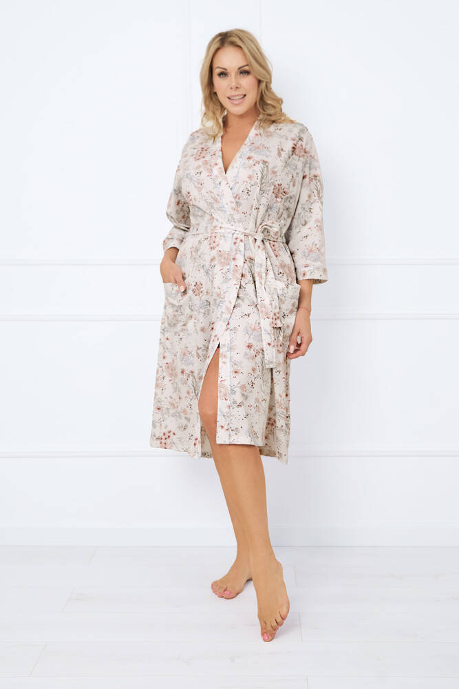 țara de producție: POLONIAIată un halat pentru femei care are o croială clasică pentru confort. Bandă decorativă la margini. Există bucle pentru curea la nivelul taliei. Imprimeul floral adaugă o notă romantică, clasă și delicatețe aspectului general. Două buzunare pe părțile laterale, făcând modelul mai practic. Toate sunt realizate din bumbac 100% neted.