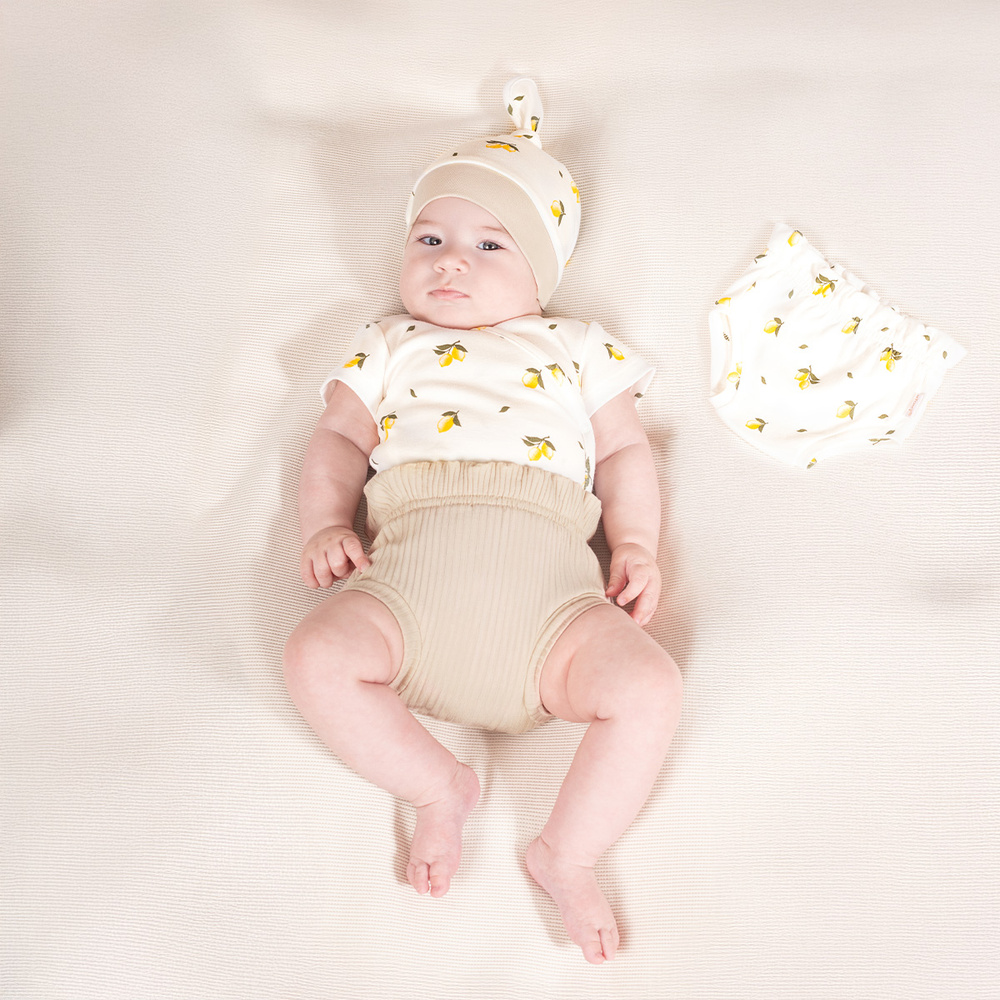 Pachet de 2 flori pentru fete, perfecte pentru vara fierbinte. Unul este din bumbac imprimat cu un model frumos, celălalt este bej. Materialul are o cantitate mică de elastan. Îmbrăcămintea are o bandă elastică în talie care nu apasă pe burta bebelușului. In acest stil avem un volan in talie, care este completat de o fundita. Materialul are certificatul Oeko-Tex Standard 100 Trustworthy Textiles.