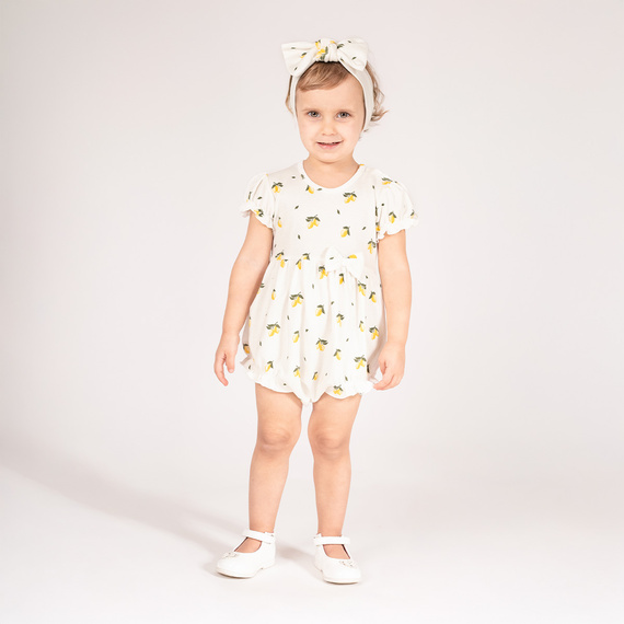 Salopetă pentru fete din bumbac cu mâneci scurte. Modelul este decorat cu un imprimeu fermecător, realizat folosind o metodă durabilă și sigură de vopsea pe bază de apă. Capacitatea de a desface fermoarul ramperului de la nivelul picioarelor și de pe umărul stâng face mult mai ușoară îmbrăcarea și schimbarea bebelușului. Încuietorile sunt realizate din material antialergic, fără nichel.