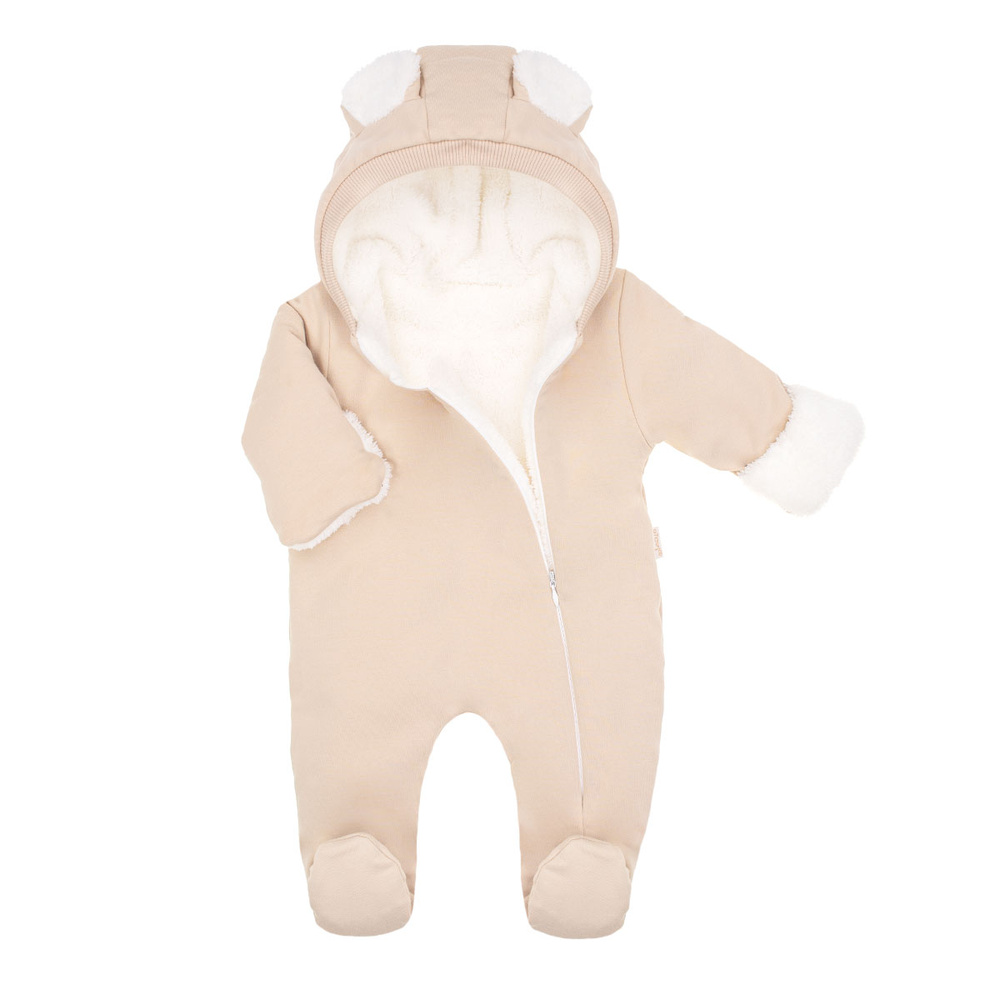 Manta izolatoare din bumbac hanorac bej cu o cantitate mica de elastan. Este căptușită cu blană albă, ceea ce face ca haina să fie perfectă pentru zilele reci. Întregul este decorat cu o glugă cu urechi. Îmbrăcămintea are mâneci suflecate pentru a proteja mâinile copilului de frigul în aer liber. Există un petic nor cusut în față. Mantaua este prinsă cu un fermoar convenabil - acest lucru va face îmbrăcarea mai ușoară. Materialul este complet sigur pentru pielea copiilor.