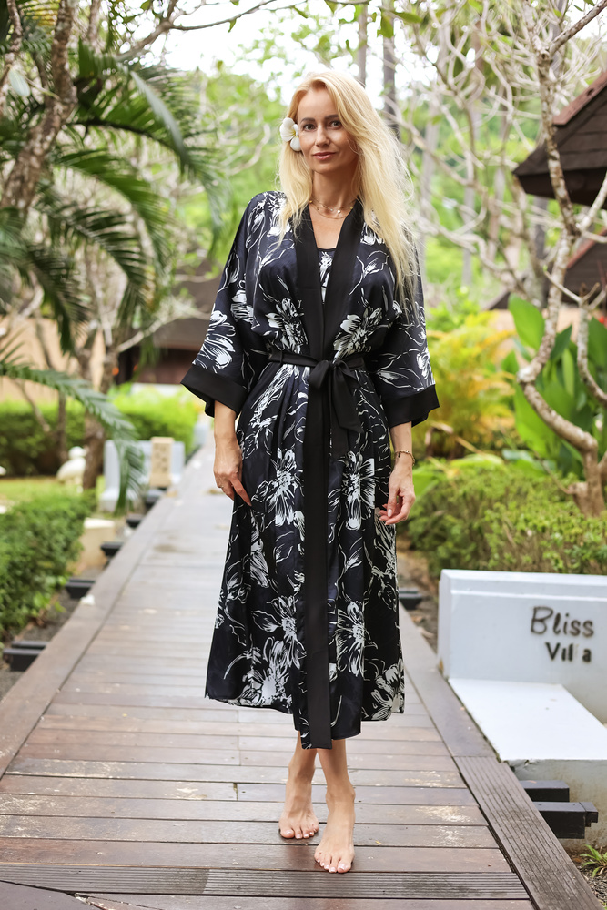 Forma relaxată cu mâneci mai largi adaugă lejeritate și eleganță. Satin modelat de înaltă calitate. Cureaua vă va permite să ajustați talia după cum doriți. De asemenea, puteți folosi halatul de casă pe post de costum de baie.