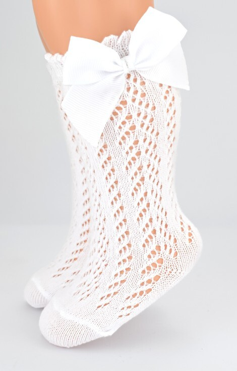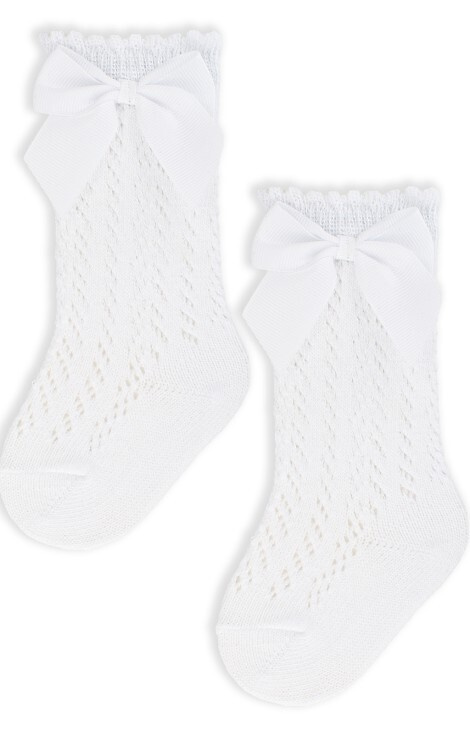 Șosete pentru fete până la genunchi, decorate cu model ajurat și fundă.
