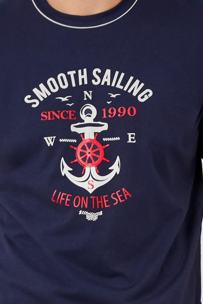 Pijama scurtă pentru bărbați în stil nautic din bumbac 100%. Se distinge prin croiala sa simplă și confortabilă. Tricoul cu mânecă scurtă, cu decolteu rotund, împodobit cu bordură, este decorat cu un imprimeu cu ancoră și litere elegante pentru a-i sublinia caracterul. Setul este completat de pantaloni scurți solizi cu buzunare.