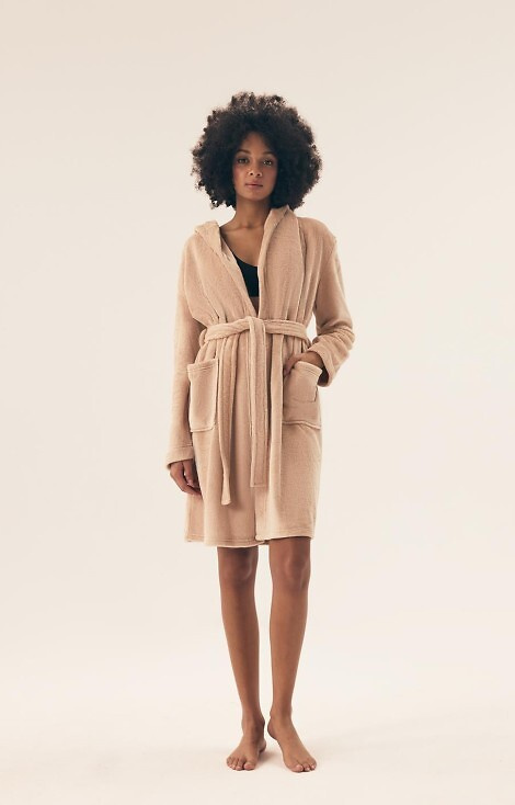 Țesătură moale, pufoasă, moale. Rochia are glugă de șal și buzunare. Legat în talie.