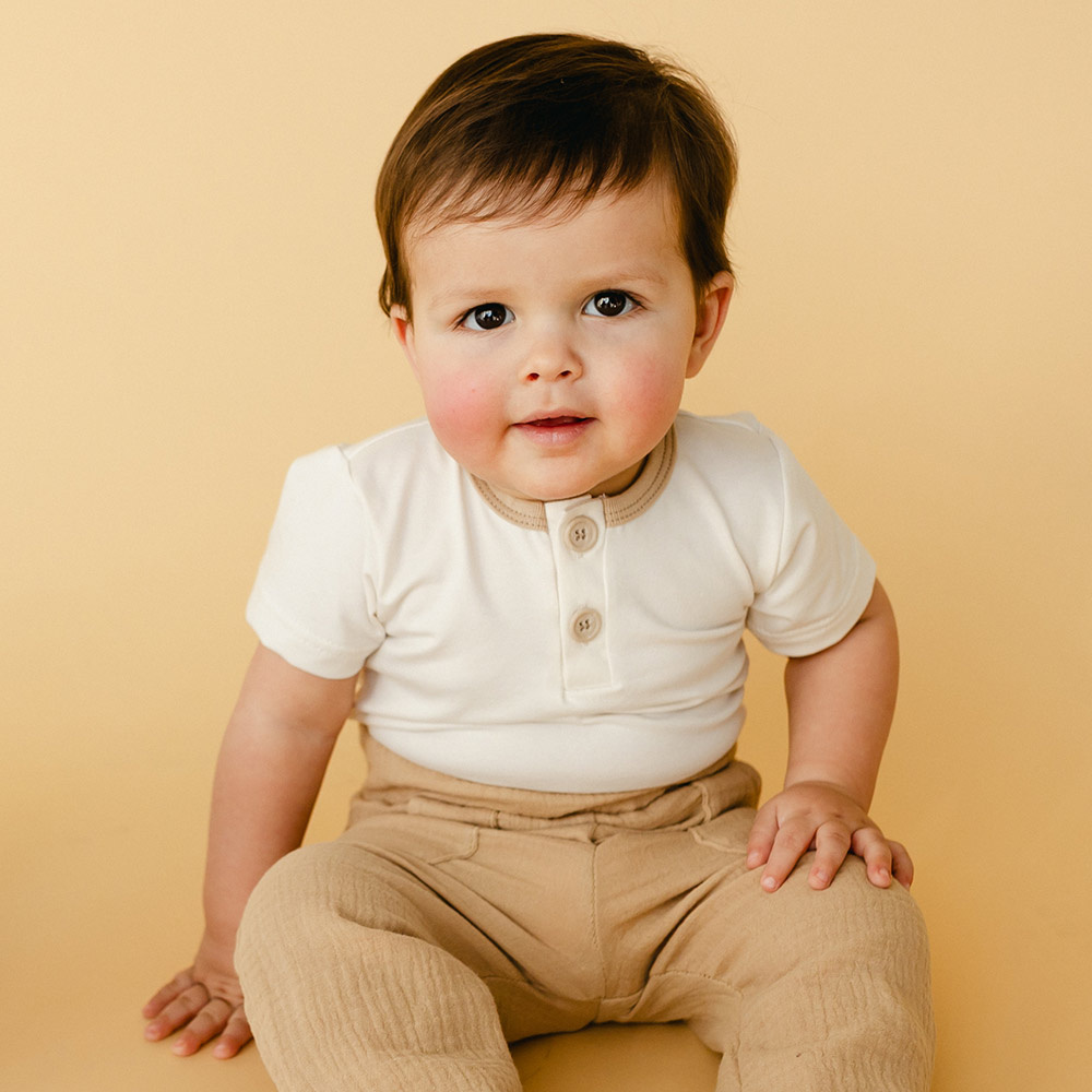 Body polo cu mâneci scurte ecru. Bodyurile pentru copii sunt perfecte pentru copiii cu vârsta de până la 3 ani. Mamele aleg cel mai adesea body-uri pentru bebelusii lor. Acesta este un must-have pentru fiecare copil sau grădiniță.