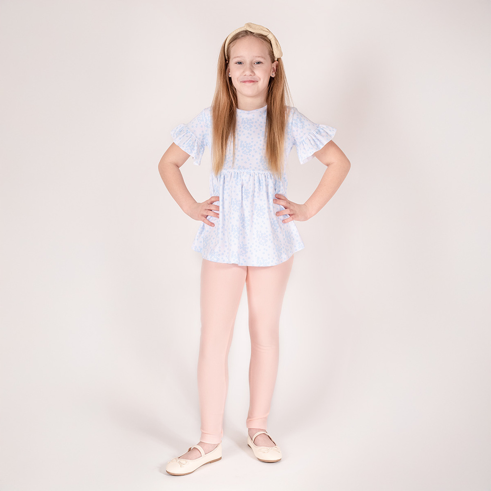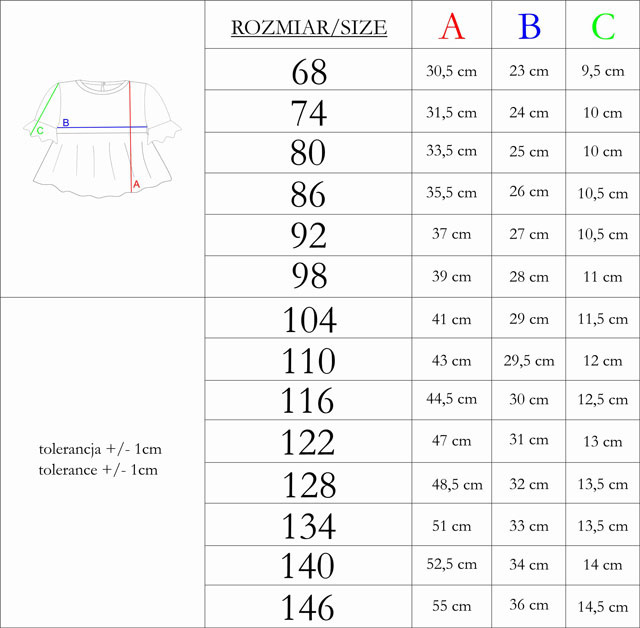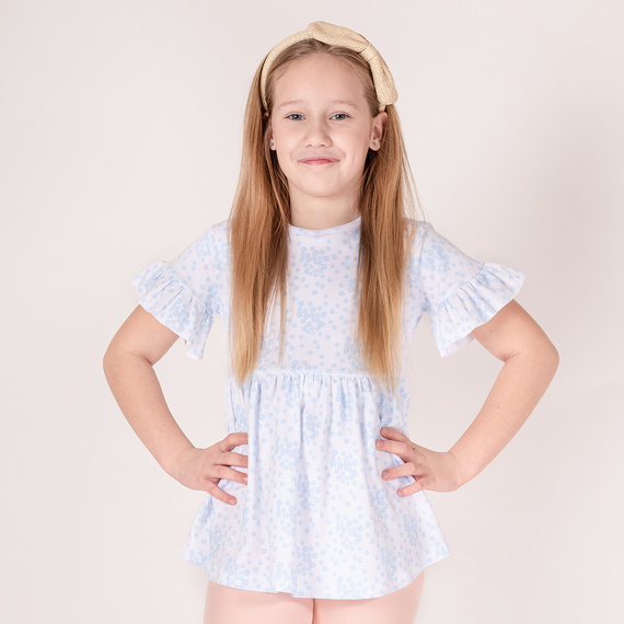Întrebați despre produsBluza cu maneca scurta pentru fete. Perfect pentru primavara si vara. Imprimarea a fost realizată folosind o metodă sigură de vopsea pe bază de apă. Modelul este decorat cu volan in partea de jos si pe umeri. Există o închidere în formă de lacrimă pe spate cu un buton cu apăsare fără nichel.