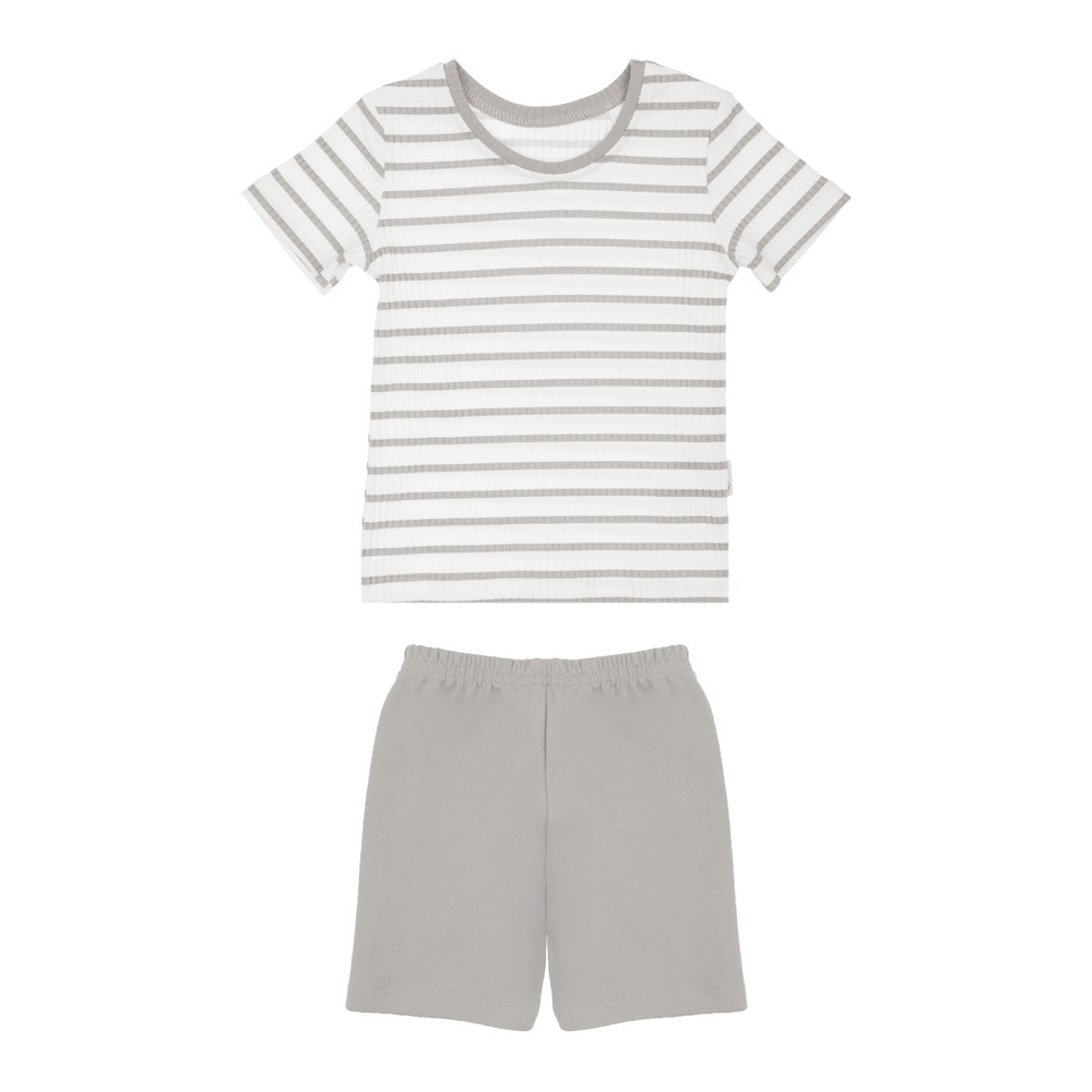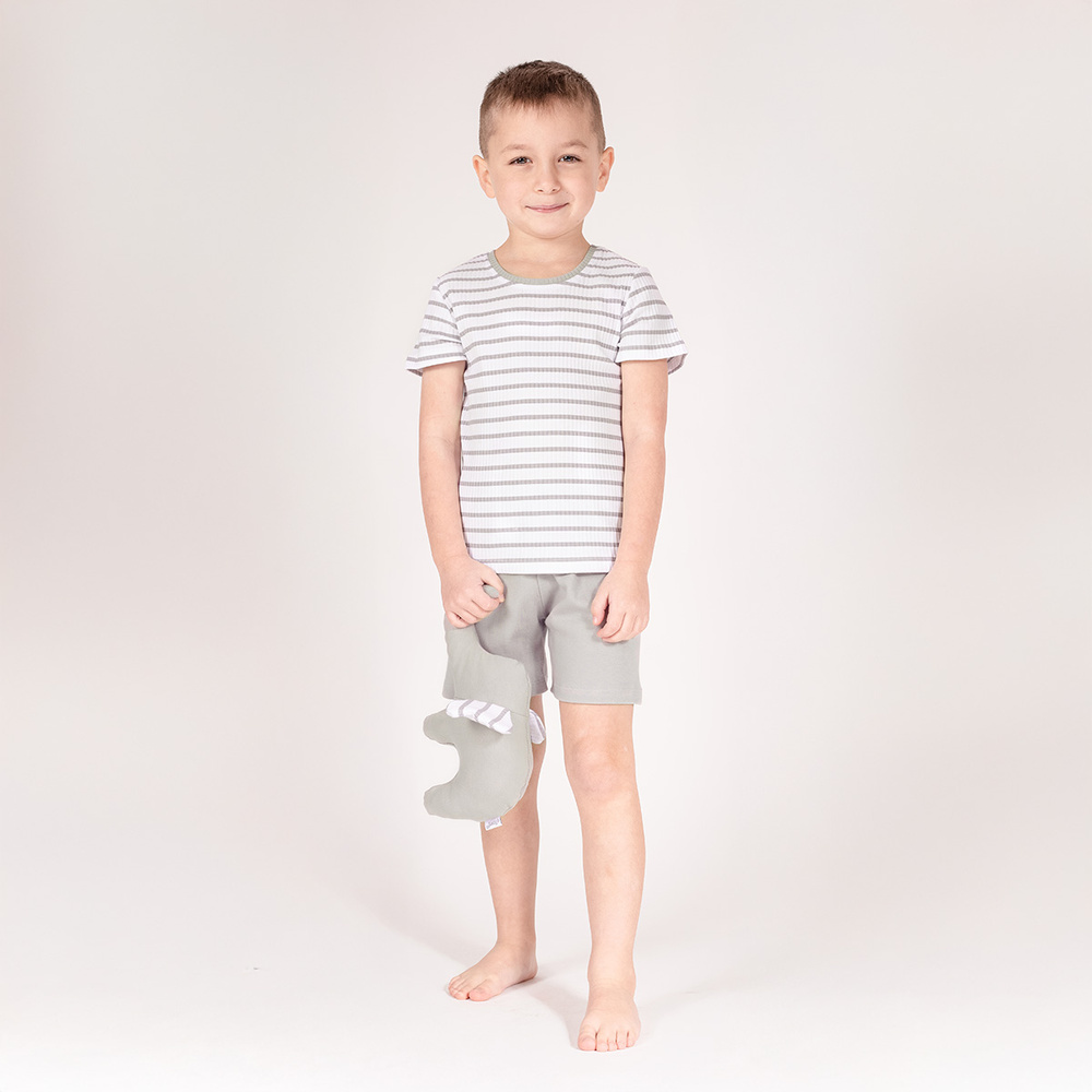 Întrebați despre produsSet din bumbac cu maneca scurta pentru un baiat. Tricou cu dungi și pantaloni scurți gri. Are certificatul Oeko-Tex Standard 100 Trustworthy Textiles. Întregul set are o croială lejeră, așa că se va potrivi oricărei figuri. Pantalonii scurți au cusut o bandă elastică confortabilă care nu strânge burta și este cusut suplimentar pentru a preveni răsucirea.