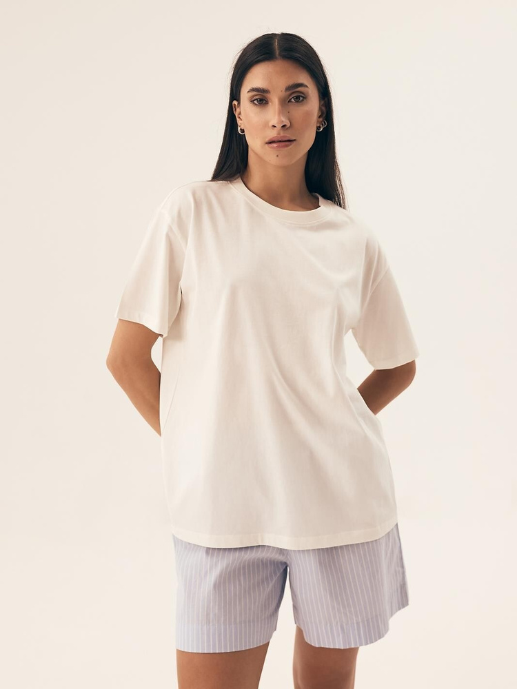 Setul include pantaloni scurți din material subțire, cu dungi.
