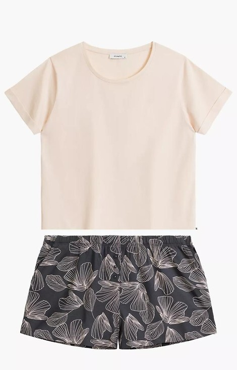 Pijamale de damă din material moale, plăcut la atingere. Tricou cu maneca scurta. Setul include pantaloni scurți, largi, cu buzunare. Bandă elastică în talie.