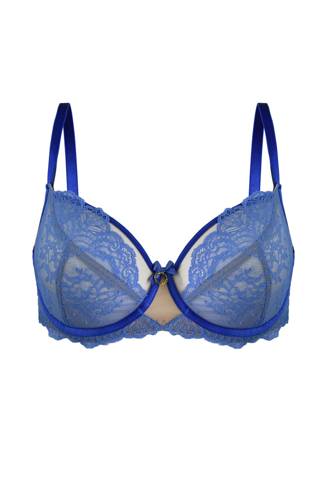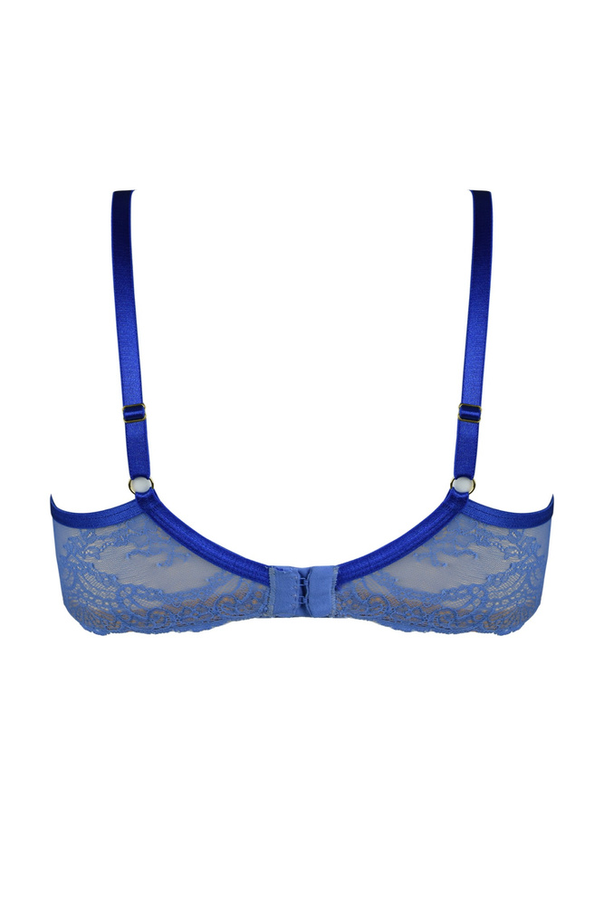 Sutien moale cu sârmă. Cupe din plasa bej acoperita cu dantela albastra, care se extinde usor deasupra cupelor. Panglicile într-o nuanță mai închisă contrastează cu întregul, iar decorul din mijloc adaugă farmec. Circumferinta este realizata din plasa tuns cu dantela, fara fire laterale. Sutien dedicat sanilor medii si mari.