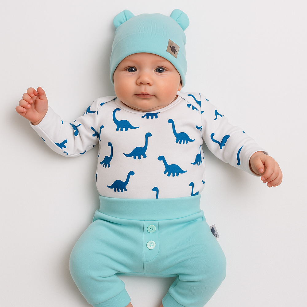 Întrebați despre produsUn set de 3 piese pentru un băiat format din pantaloni de culoarea mentă, un body cu mâneci lungi, prins la nivelul picioarelor cu capse fără nichel din bumbac alb cu motiv de dinozaur și o pălărie cu urechi. Produsul are certificatul Oeko-Tex Standard 100 Trustworthy Textiles.