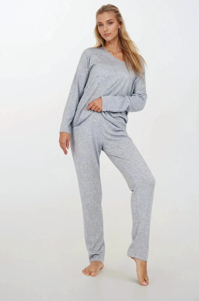 Un set de dama foarte confortabil din material placut. Bluză cu mâneci lungi, decolteu în V. Perfect ca pijamale și îmbrăcăminte de casă