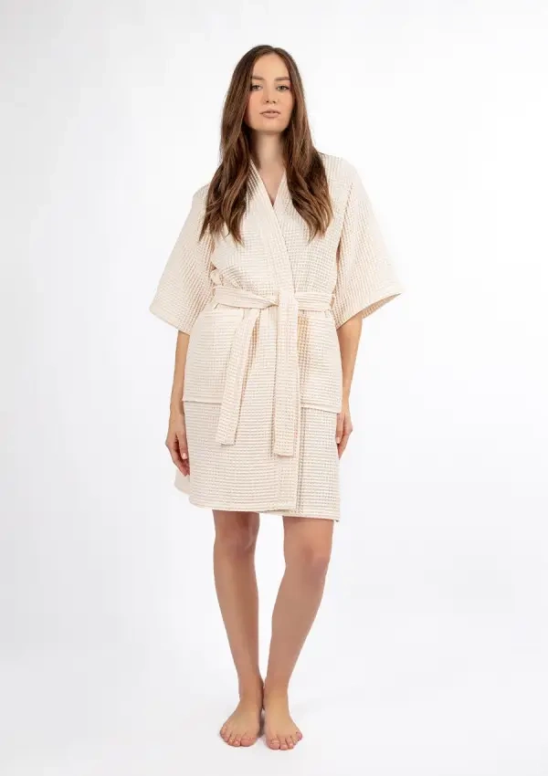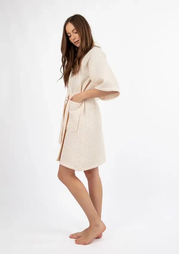 Acest halat de baie scurt de vară pentru femei este alegerea perfectă pentru zilele mai calde - este ușor, aerisit și arată excepțional de elegant. Important este că hainele noastre sunt cusute în Polonia, cu atenție la detalii și calitatea manoperei. Halatul de baie este confecționat dintr-o țesătură unică de vafe - 100% bumbac, care este plăcut pentru piele, respirabil și perfect pentru uz casnic. Structura vafelor îi conferă un aspect interesant, dar afectează și confortul purtării - materialul nu se lipește de corp și oferă o senzație de prospețime chiar și în zilele caniculare.